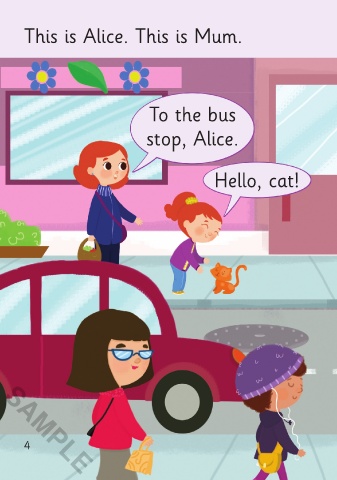 This is Alice. This is Mum. Alice sees a cat. Alice stops. To the bus stop, Alice. Hello, cat! SAMPLE 4 5 SAMPLE 3/4/21 11:24 AM Alice Stops 01-16_ChitF.indd 4-5 Alice Stops 01-16_ChitF.indd 4-5 3/4/21 11:24 AM