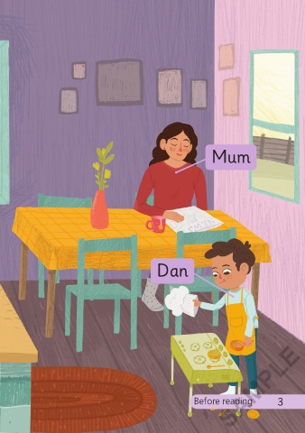 Listen and say. Dad Mum box Dan egg SAMPLE 2 Before reading 3 3/4/21 4:37 PM Dan Cook an Egg 01-16_Pah-FF.indd 2-3 Dan Cook an Egg 01-16_Pah-FF.indd 2-3 3/4/21 4:37 PM