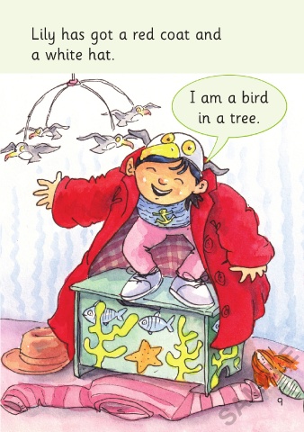 Jack finds a black dog hat. Lily has got a red coat and a white hat. I am a bird Woof! in a tree. SAMPLE 8 9 3/5/21 12:01 PM Dressing Up 01-24_ChitF.indd 8-9 Dressing Up 01-24_ChitF.indd 8-9 3/5/21 12:01 PM