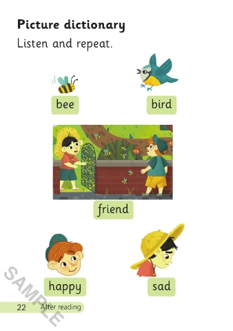 Picture dictionary 1 Look and order the story. Listen and repeat. bee bird friend SAMPLE happy sad 2 Listen and say. 22 After reading 23 SAMPLE 3/5/21 12:16 PM Happy Max 01-24_ChitF.indd 22-23 Happy Max 01-24_ChitF.indd 22-23 3/5/21 12:16 PM