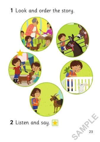 Picture dictionary 1 Look and order the story. Listen and repeat. dog donkey goat SAMPLE rabbit sheep 2 Listen and say. 22 After reading 23 3/5/21 12:55 PM Not That Goat 01-24_ChitF.indd 22-23 3/5/21 12:55 PM Not That Goat 01-24_ChitF.indd 22-23