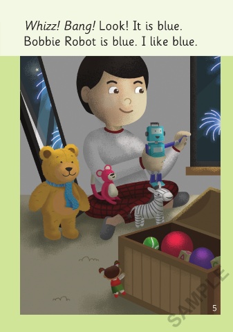 Whizz! Bang! Look! What is this? Whizz! Bang! Look! It is blue. Bobbie Robot does not like it. Bobbie Robot is blue. I like blue. SAMPLE 4 5 3/5/21 1:00 PM Whizz Bang 01-24_ChitF.indd 4-5 Whizz Bang 01-24_ChitF.indd 4-5 3/5/21 1:00 PM