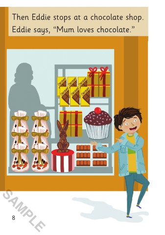 Then Eddie stops at a chocolate shop. Kate says, “No. Not chocolate.” Eddie says, “Mum loves chocolate.” SAMPLE 8 9 SAMPLE 3/5/21 3:45 PM A Present for Mum 01-24_Chit1P.indd 8-9 A Present for Mum 01-24_Chit1P.indd 8-9 3/5/21 3:45 PM