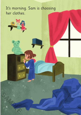 It’s morning. Sam is choosing Sam says, “I love my blue T-shirt and