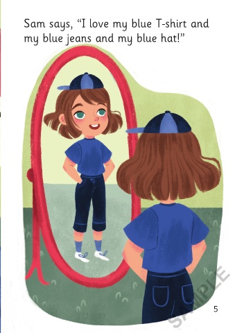 It’s morning. Sam is choosing Sam says, “I love my blue T-shirt and