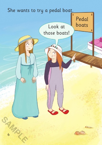She wants to try a pedal boat. Julia and her mum are on a pedal boat in the sea. Pedal Look at boats those boats! SAMPLE 6 7 SAMPLE 3/5/21 4:15 PM Bye-bye Turtle 01-24_ChitF.indd 6-7 Bye-bye Turtle 01-24_ChitF.indd 6-7 3/5/21 4:15 PM