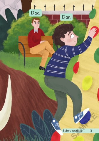 Who and what is in this story? Dad Listen and say. Dan cave bear mammoth Cave Boy SAMPLE 2 Before reading 3 3/8/21 11:15 AM Cave Boy 01-24_ChitF.indd 2-3 Cave Boy 01-24_ChitF.indd 2-3 3/8/21 11:15 AM