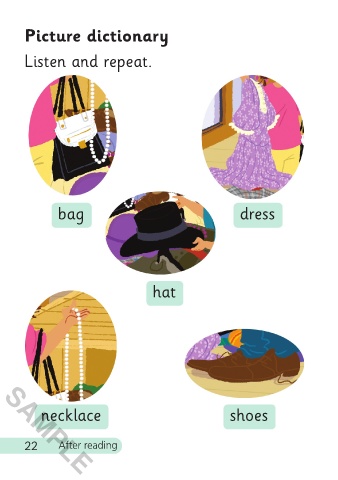 Picture dictionary 1 Look and order the story. Listen and repeat. bag dress hat SAMPLE necklace shoes 2 Listen and say. 22 After reading 23 SAMPLE 3/8/21 11:19 AM Croc Knows 01-24_ChitF.indd 22-23 Croc Knows 01-24_ChitF.indd 22-23 3/8/21 11:19 AM