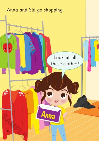 Anna and Sid go shopping. Sid says, “Hats! Scarves! Shoes!