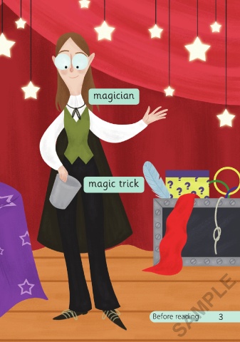 What’s in this story? Listen and say. theatre magician magic trick wand SAMPLE 2 Before reading 3 3/8/21 3:42 PM Mona s Magic Trick 01-24_SY2P.indd 2-3 3/8/21 3:42 PM Mona s Magic Trick 01-24_SY2P.indd 2-3