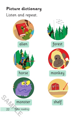 monster shelf 2 Listen and say.