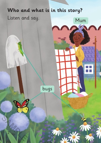 Who and what is in this story? Listen and say. Mum Ali Dina bugs SAMPLE 2 Before reading 3 SAMPLE 3/9/21 11:35 AM The Garden Game 01-24_ChitF.indd 2-3 The Garden Game 01-24_ChitF.indd 2-3 3/9/21 11:35 AM