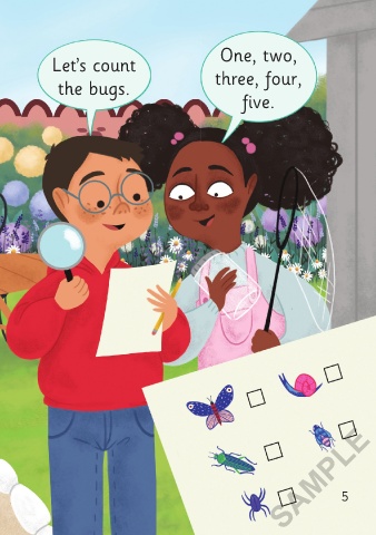 Dina and Ali are playing a garden game. Let’s count One, two, Can they find the bugs? the bugs. three, four, five. SAMPLE 4 5 3/9/21 11:35 AM The Garden Game 01-24_ChitF.indd 4-5 The Garden Game 01-24_ChitF.indd 4-5 3/9/21 11:35 AM