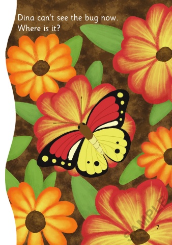 Dina can see a bug. It’s a red and Dina can’t see the bug now. yellow butterfly. Where is it? Look! SAMPLE 6 7 3/9/21 11:35 AM The Garden Game 01-24_ChitF.indd 6-7 The Garden Game 01-24_ChitF.indd 6-7 3/9/21 11:35 AM