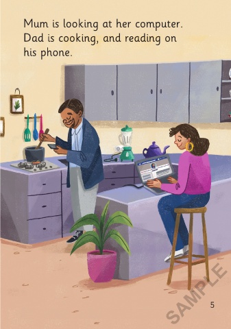 Lucy is reading a book on her tablet. Dad is cooking, and reading on