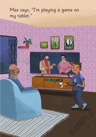 Grandpa says, “Hello, Max. This is Max says, “I’m playing a game on funny. Come and see.” my tablet.” SAMPLE 8 9 3/9/21 11:37 AM TV Time 01-24_Chit2P.indd 8-9 TV Time 01-24_Chit2P.indd 8-9 3/9/21 11:37 AM