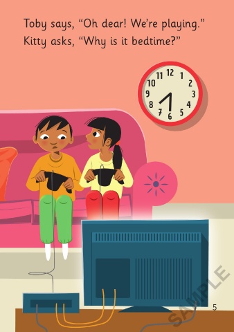 Daddy says, “Kitty! Toby! It’s time Kitty asks, “Why is it bedtime?”