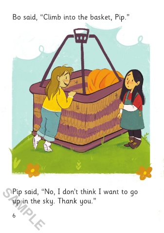 Bo said, “Climb into the basket, Pip.” Pip said, “I never go up in the sky, Bo.”