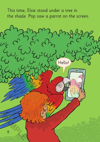 the shade. Pop saw a parrot on the screen. “Pop! I want a photo of both of us!”
