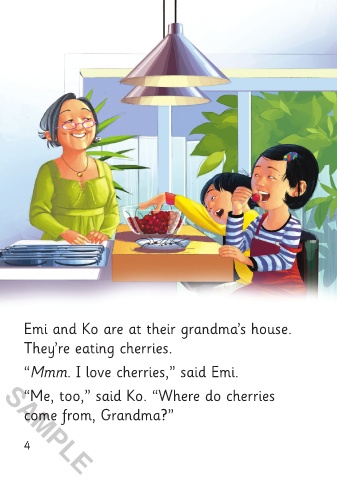 Emi and Ko are at their grandma’s house. “Cherries come from plants,” said