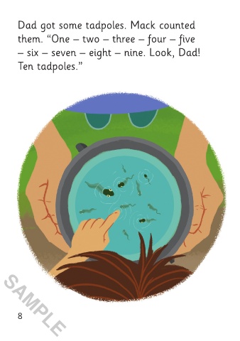Dad got some tadpoles. Mack counted Mum saw a frog. “Look!” she said.