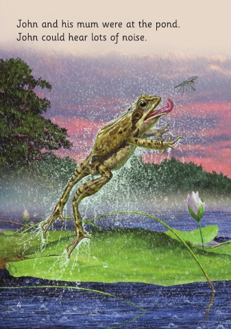 John and his mum were at the pond. Mum said, “Listen, John. The frogs