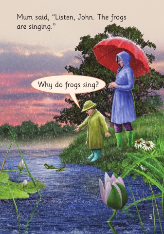John and his mum were at the pond. Mum said, “Listen, John. The frogs