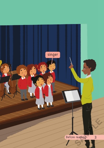 What’s in this story? Listen and say. orchestra trumpet singer violin SAMPLE piano 2 Before reading 3 3/22/21 9:50 AM Too Sick To Sing_ChitF.indd 2-3 Too Sick To Sing_ChitF.indd 2-3 3/22/21 9:50 AM
