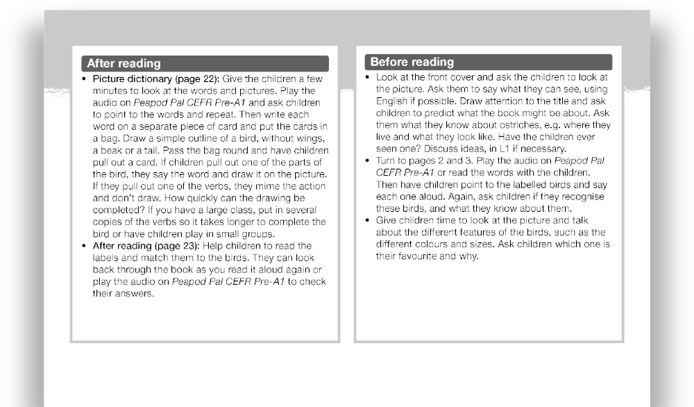 Audioscripts for the After Reading activities are laid out clearly in the reading guides. Use these scripts to help children build strong listening and speaking skills as they progress along the Peapod Readers levels.